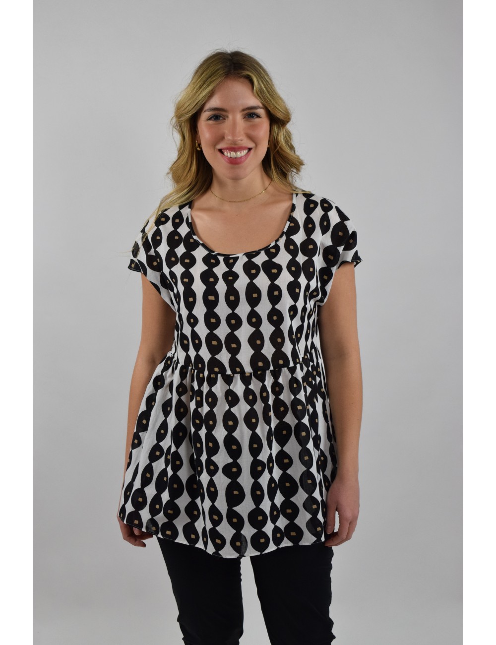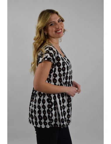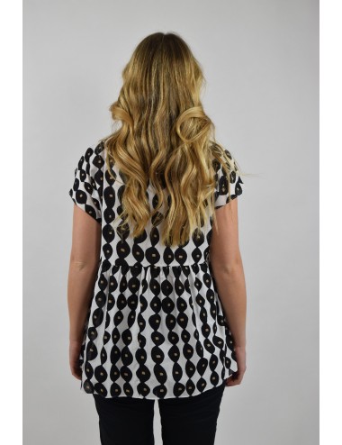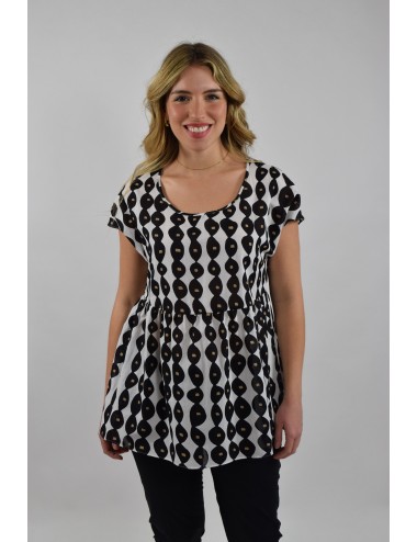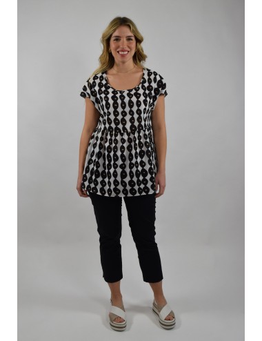 Stampa in esclusiva per la blusa in mussola di cotone con taglio e arricciatura. Linea boxi, collo tondo e maniche corte a kimono. Sfoderata.