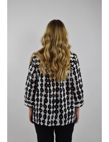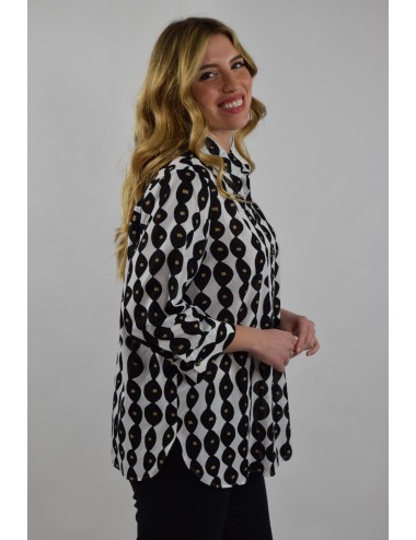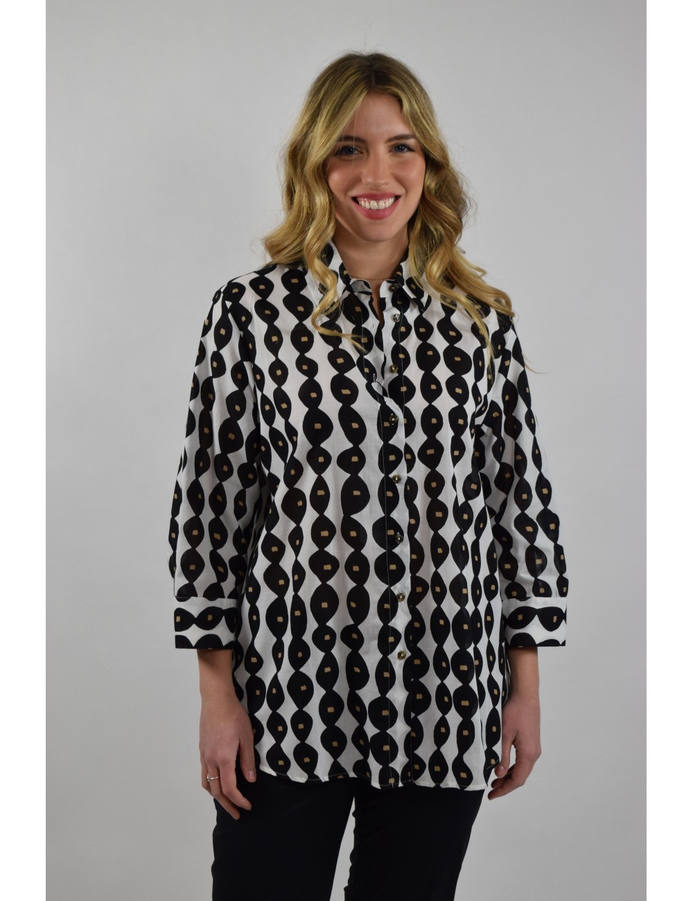 Fresca e impalpabile la casacca in mussola di puro cotone con stampa in esclusiva. Linea morbida, maniche a tre quarti con polsino e bottone, taglio carré sul retro. Fondo arrotondato